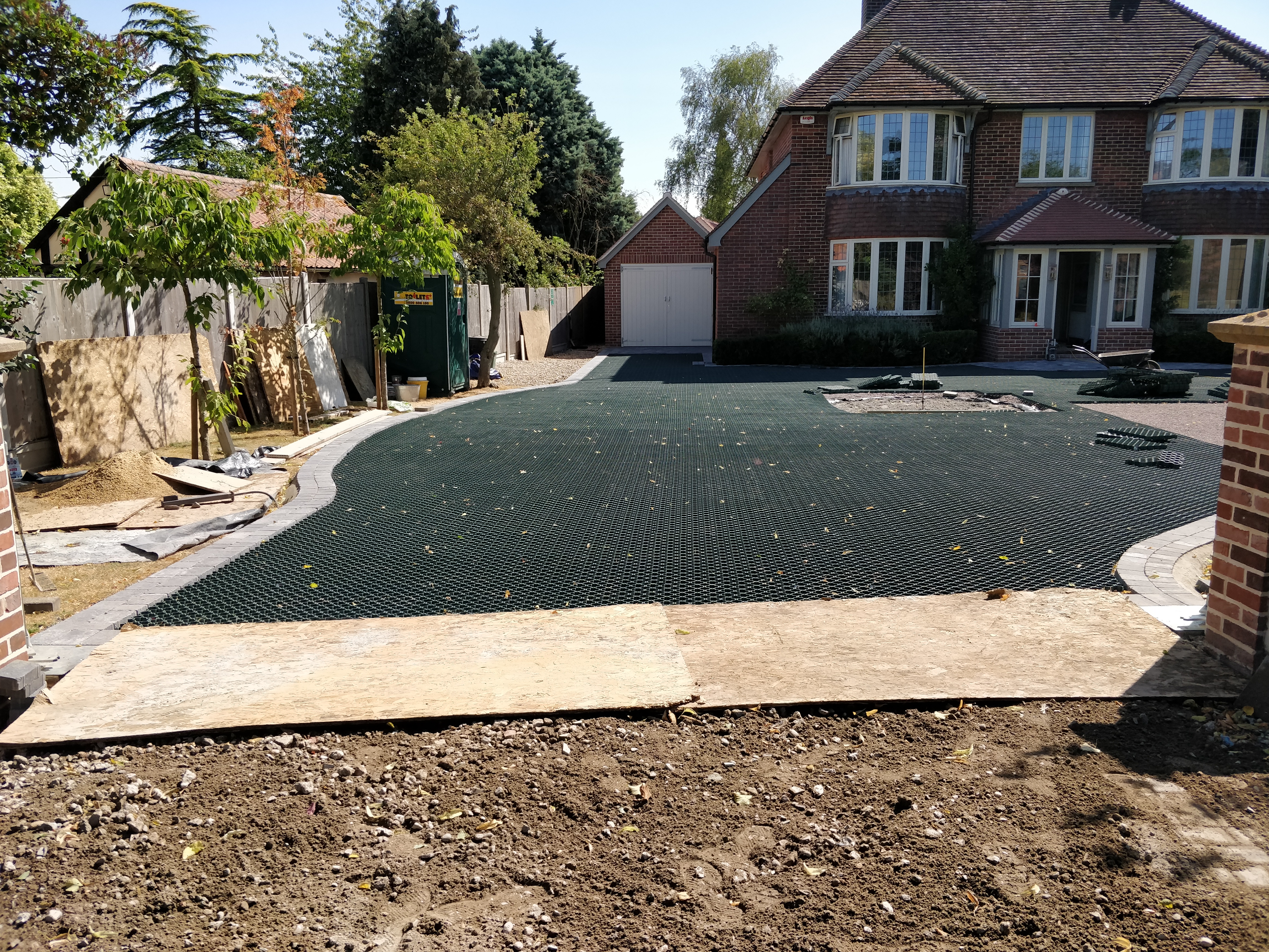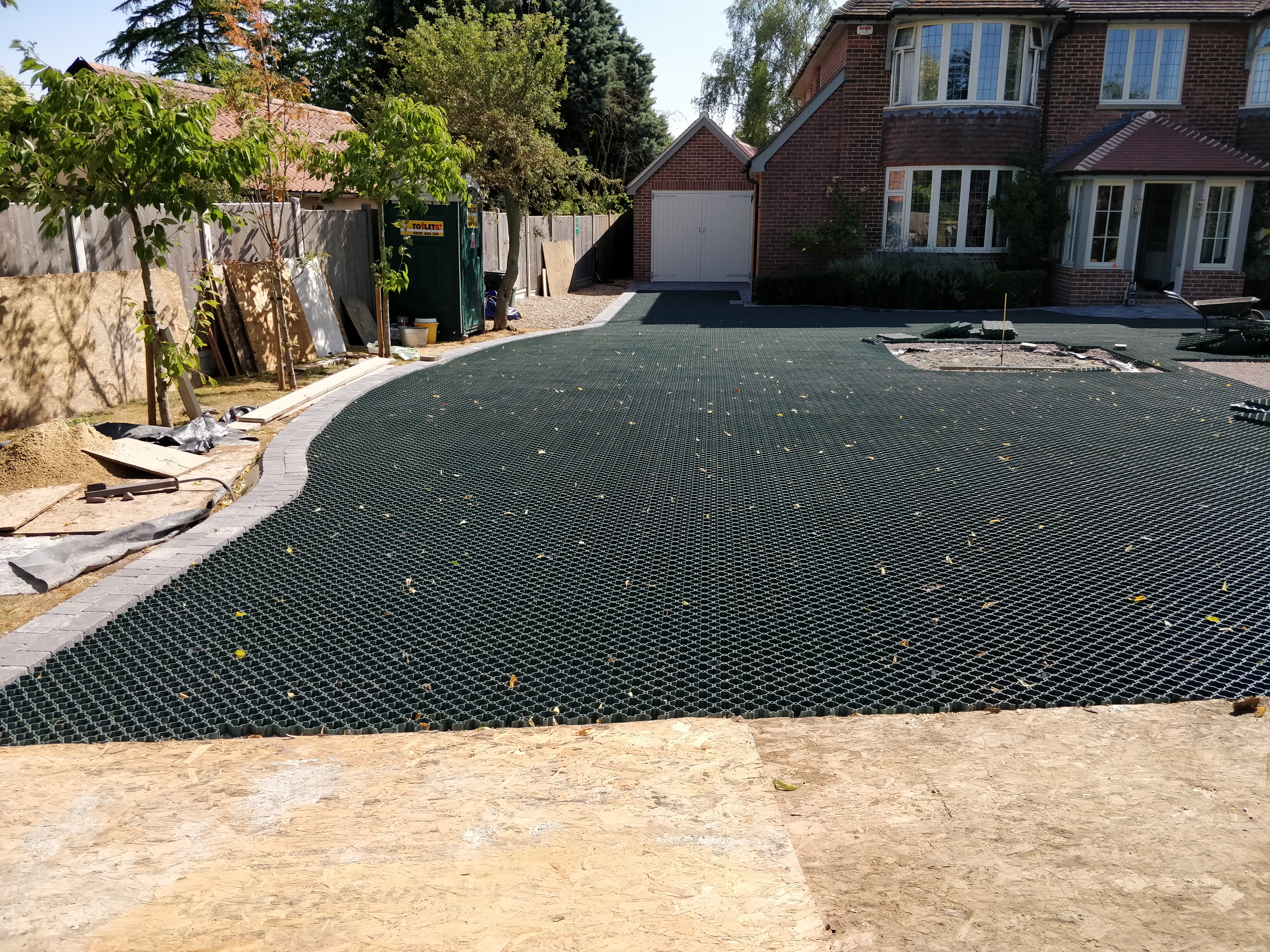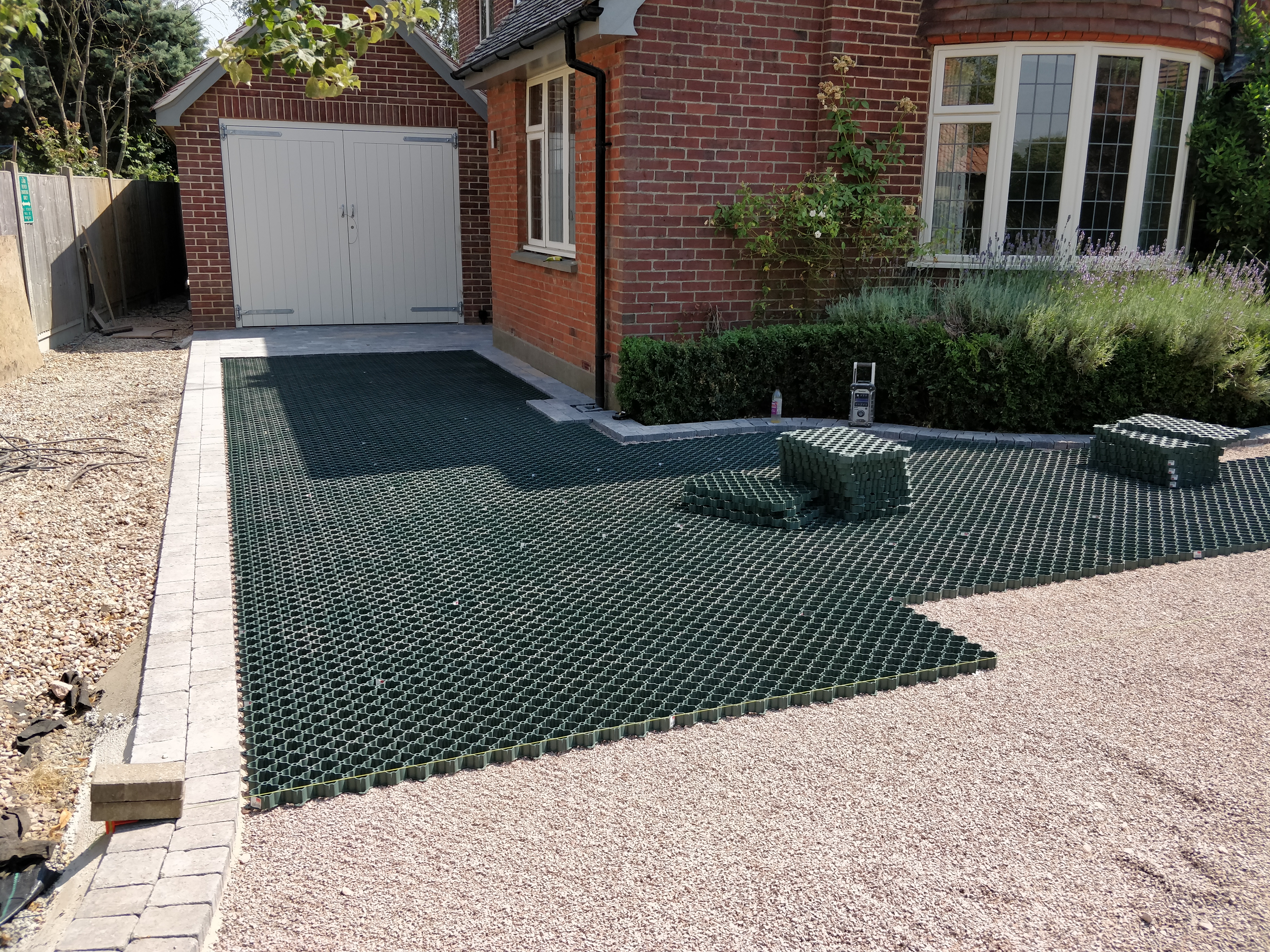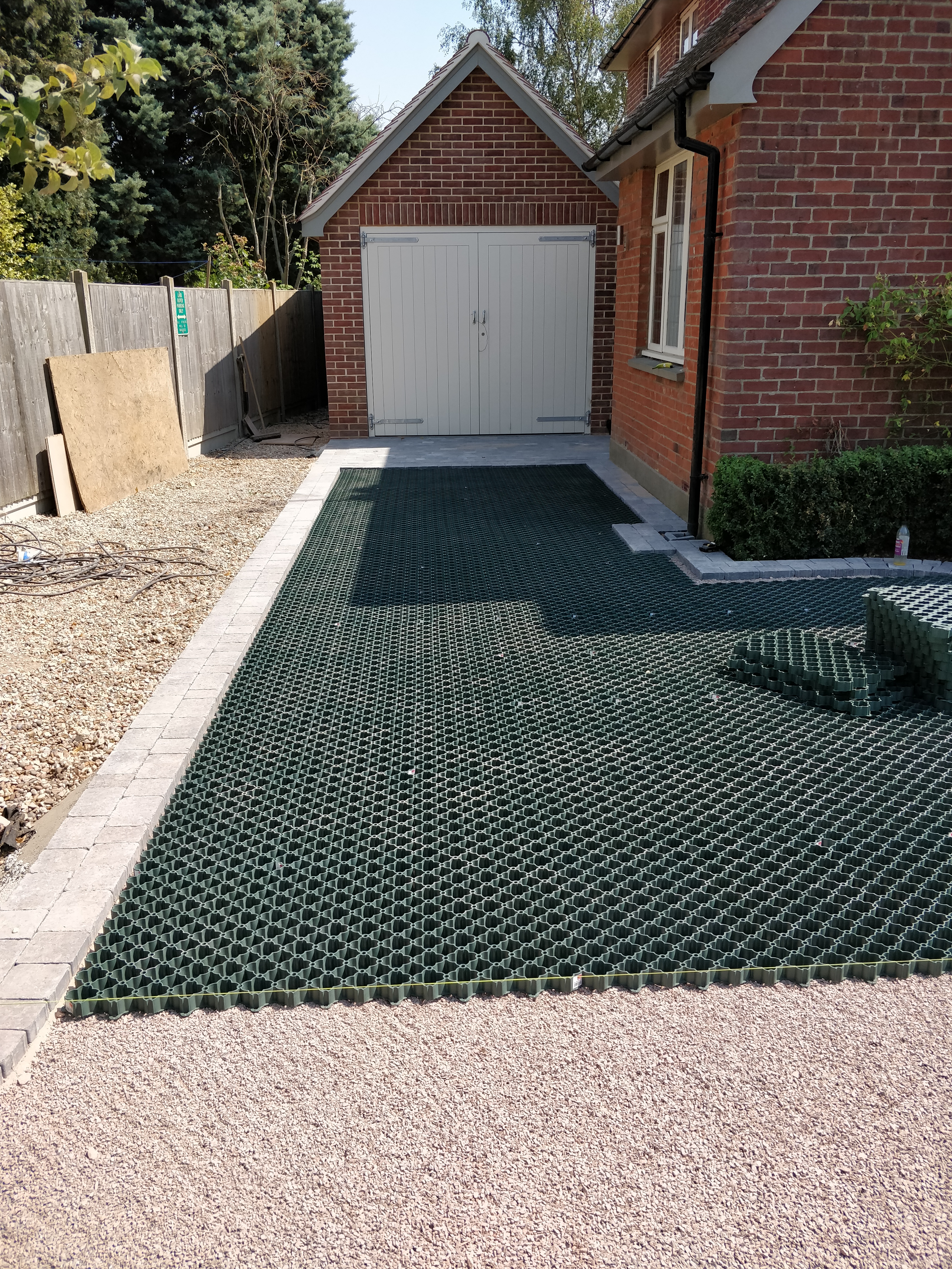 As i was renewing an existing driveway there was already a good sub-base. This was re shaped to fit the new shape and edging that was installed. Once this was done crushed granite was laid to a level. This was the compacted before the next stage. The a finer crushed granite was laid before the grid system was installed.